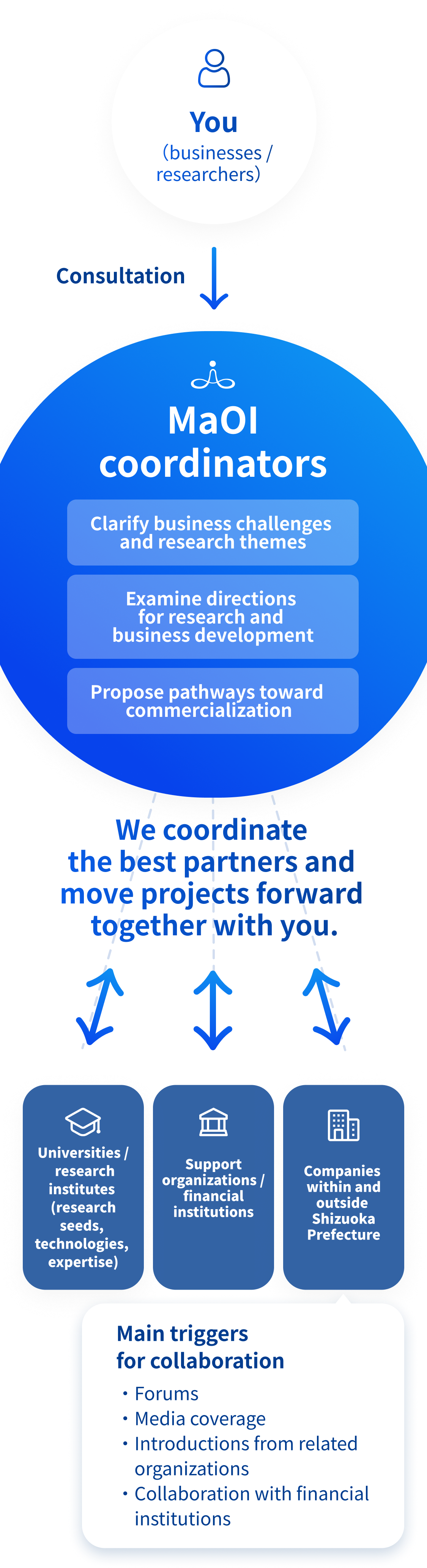 MaOI coordinators receive consultations on both business and research, and then build optimal collaborations and proposals.